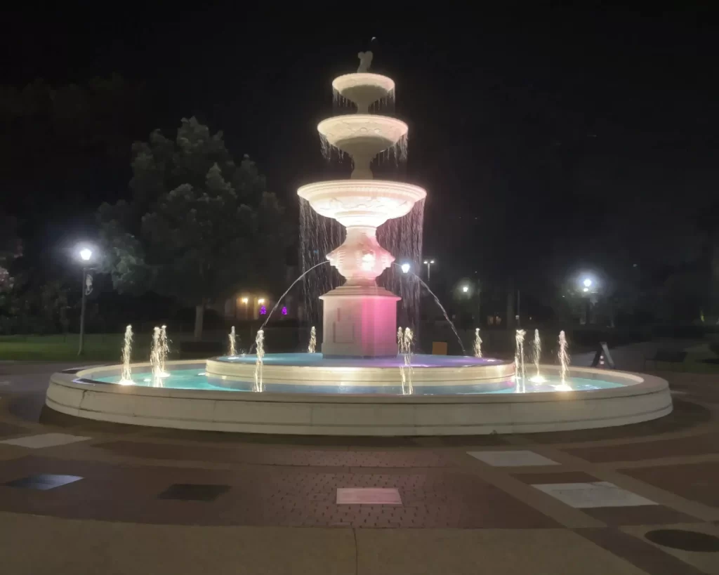 アメリカの大学あるあるの、シンボル的な噴水です。夜に散歩して見に行くと綺麗なので、おすすめです。